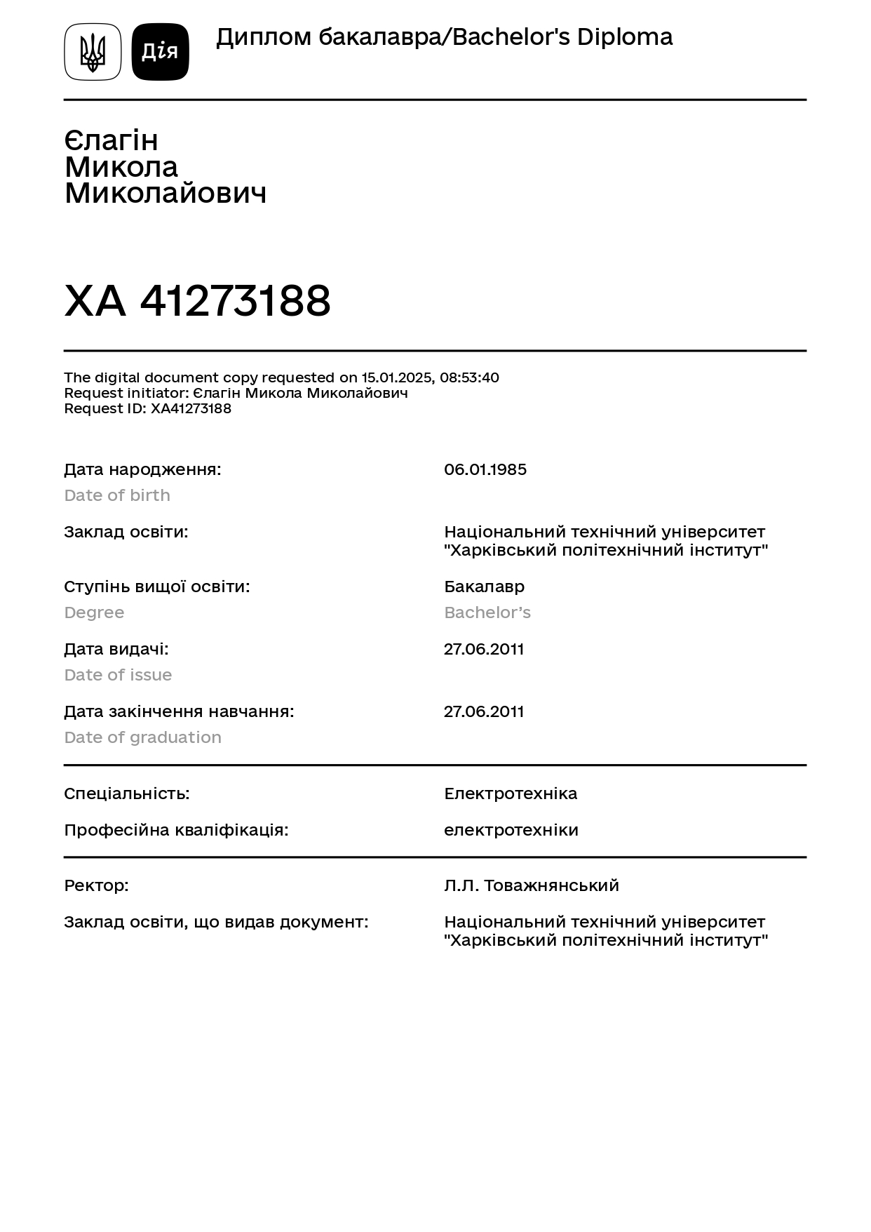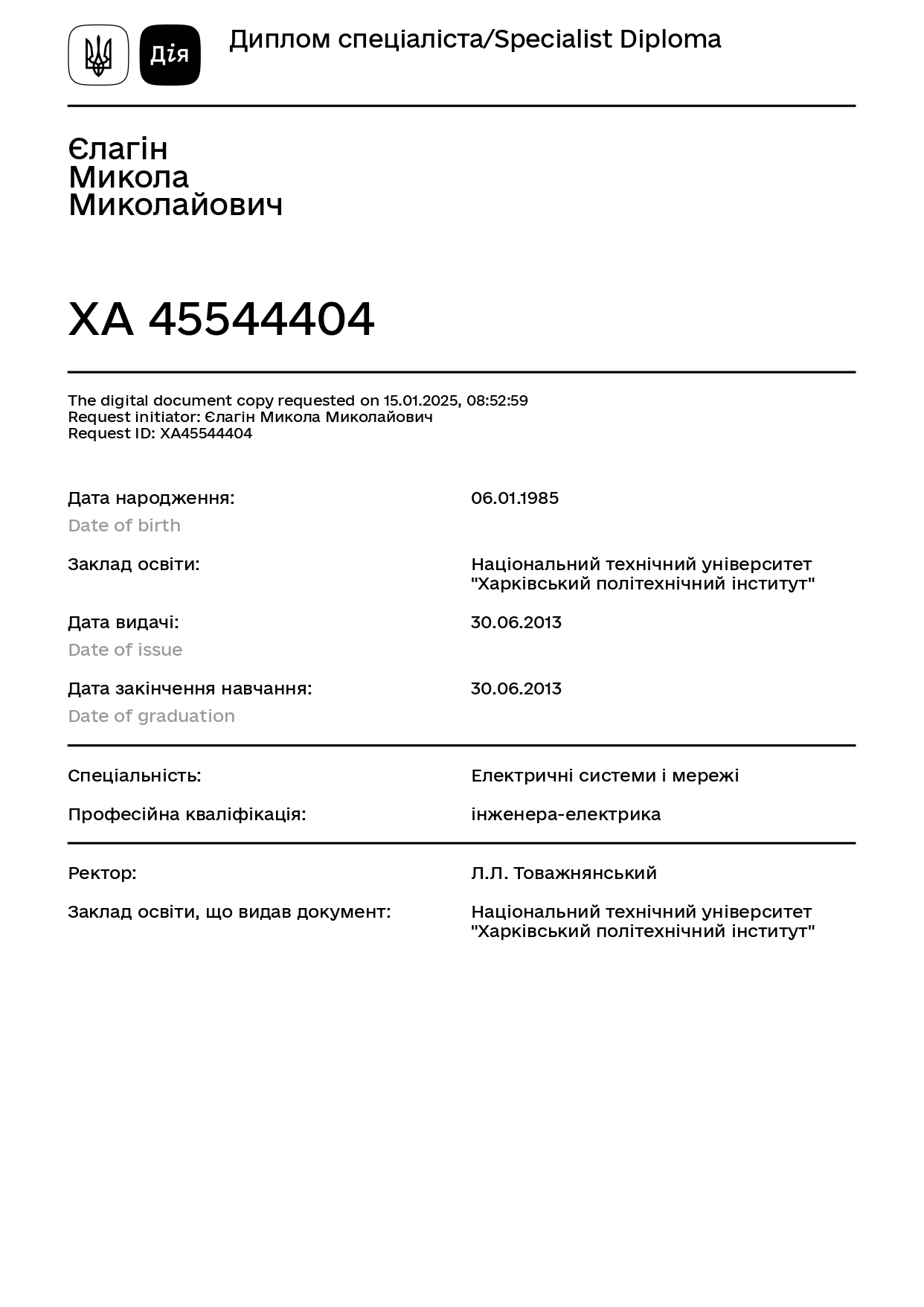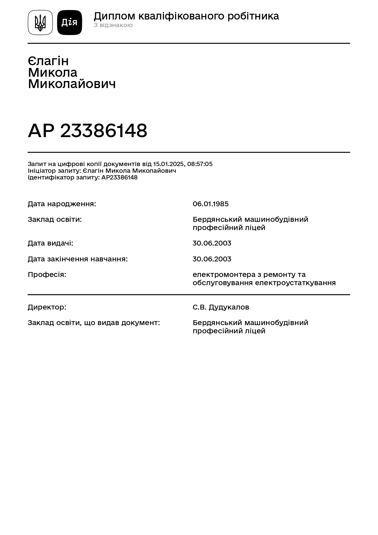 Привіт 👋 Мене звати Микола. Я люблю майструвати, та ремонтую електричні - акумуляторні інструменти та обладнання 🛠️. Маю відповідні знання та проходив навчання в Технічному університеті та машинобудівельному професійному ліцеї (див. далі Дипломи кваліфікованого спеціаліста та робітника) 🎓.